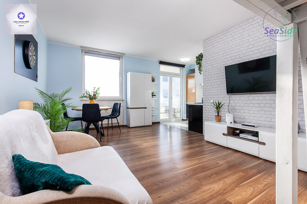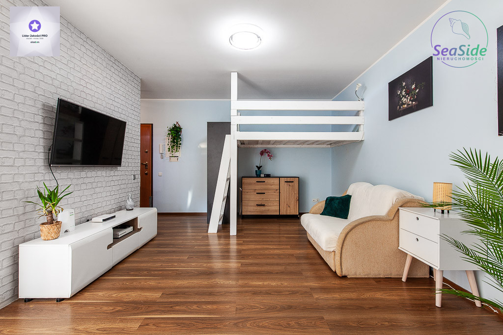Mieszkanie składa się ze słonecznego salonu z aneksem kuchennym, łazienki z toaletą oraz przedpokoju. Aneks kuchenny został w pełni wyposażony w zabudowę kuchenną i niezbędne sprzęty AGD (płyta indukcyjna, lodówka, zmywarka). W łazience wanna oraz toaleta. Całość dopełnia funkcjonalna antresolą z funkcją spania. Z salonu wyjście na balkon o ekspozycji południowo - zachodniej.
