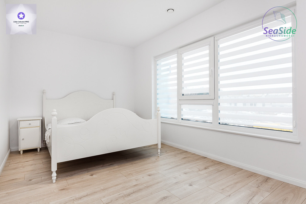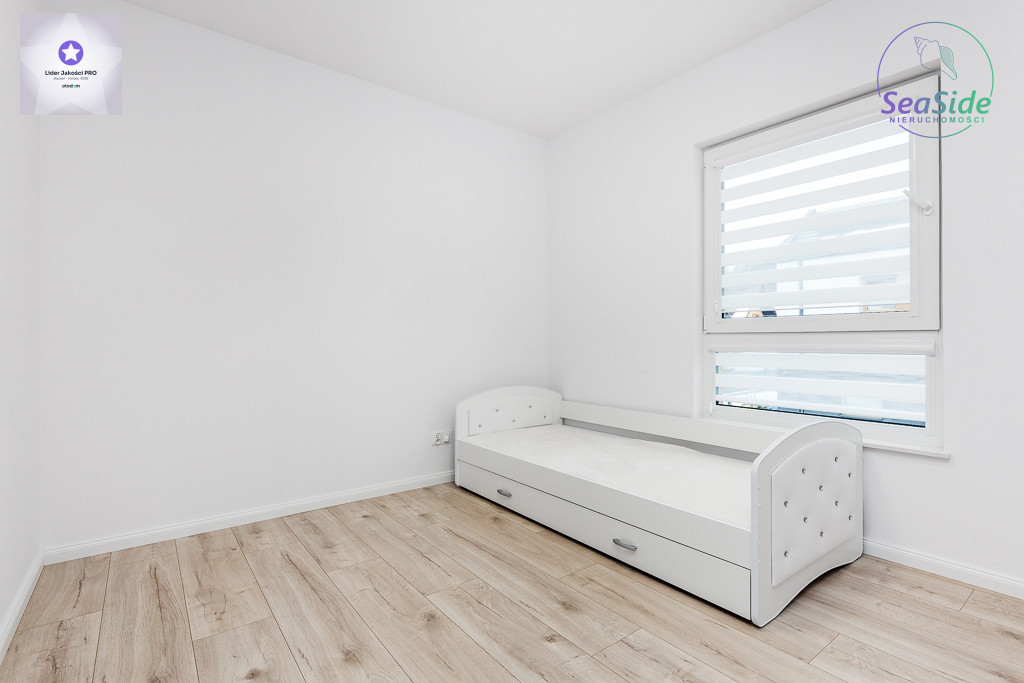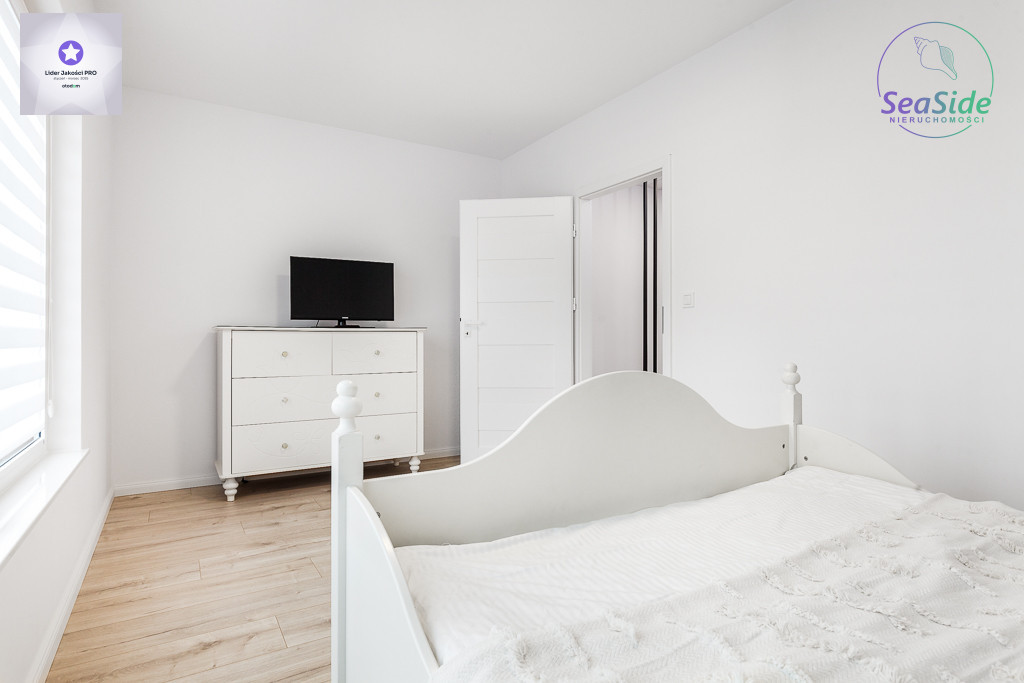 Na piętrze znajdują się 3 sypialnie oraz łazienka z prysznicem. Główna sypialnia wyposażona w łóżko małżeńskie z materacem i TV, mniejsza w łóżeczko dziecięce. Z piętra wejście chowaną drabiną na poddasze, które może pełnić funkcję miejsca do przechowywania.