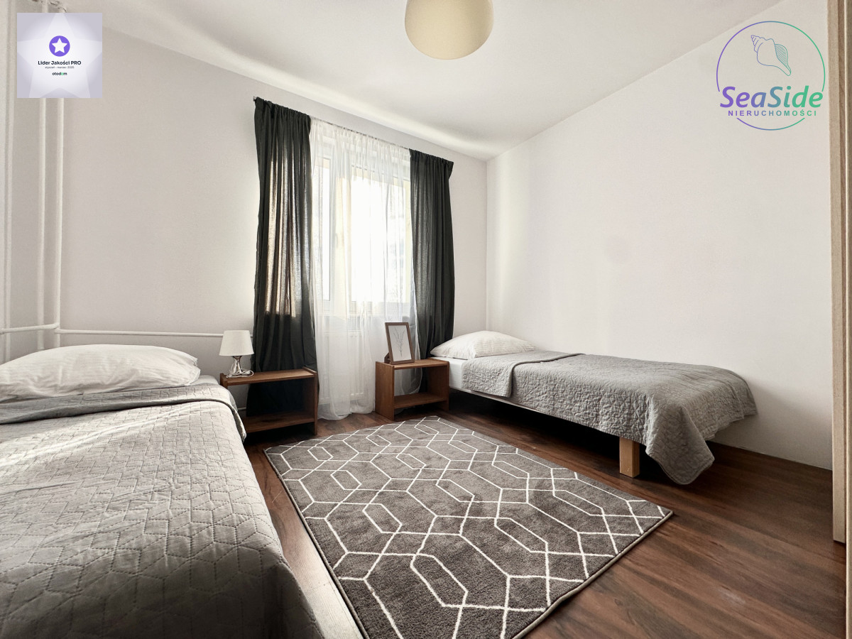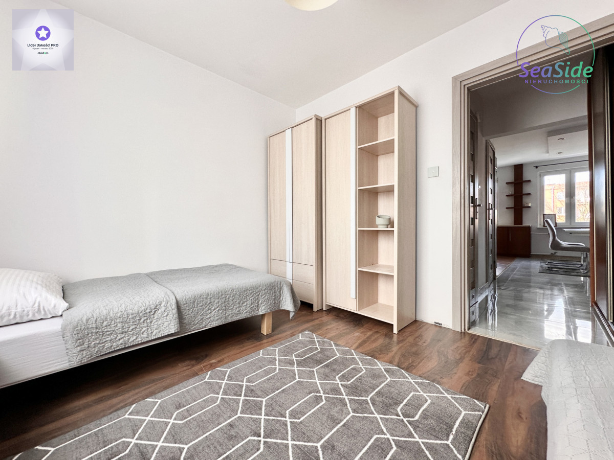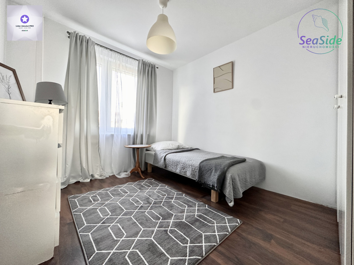 Lokal (68 m2) składa się ze słonecznego salonu z wyjściem na duży balkon, z którego rozpościera się widok na panoramę miasta i tereny zielone wokół budynku, 2 sypialni oraz dużej otwartej kuchni z jadalnią, która może pełnić funkcję salonu z aneksem kuchennym. Mieszkanie odświeżone i wyposażone w niezbędne meble i sprzęty RTV i AGD (duża lodówka, płyta grzewcza, piekarnik, zmywarka itp.).
